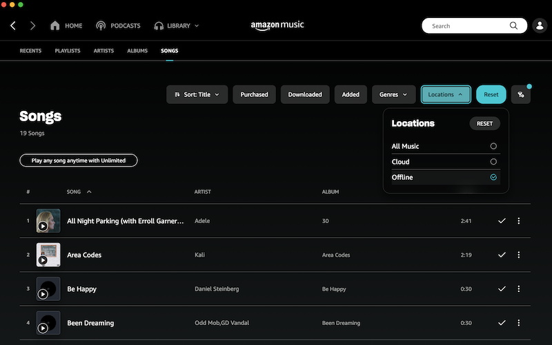 5.- Para reproducir la música local con Amazon Music. Para reproducir la música local cargada con la aplicación Amazon Music, ve a Biblioteca – Música – Canciones. Haz clic en Localizaciones y elige Fuera de línea.