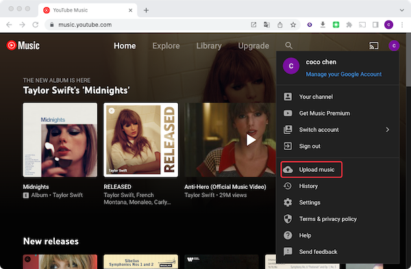 1. Para subir tu colección de música personal a la biblioteca de YouTube Music, debes abrir music.youtube.com en un ordenador. Ve a music.youtube.com en tu navegador, inicia sesión en tu cuenta de YouTube Music. Arrastra tus canciones a cualquier superficie o haz clic en el icono de tu perfil y elige Subir música.
