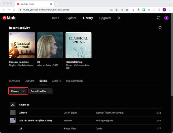 4. Las canciones subidas se mostrarán en Biblioteca – CANCIONES – Subidas. La música que subas puede tardar algún tiempo en aparecer en tu biblioteca, incluso después de que se haya subido correctamente.