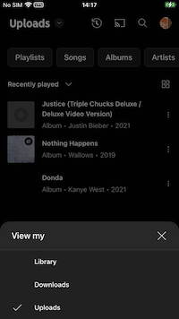 Para poder ver tus subidas en la aplicación YouTube Music, debes utilizar la versión móvil de YouTube 3.51+ o posterior. Vuelve a tocar Biblioteca en la página Biblioteca y selecciona Subidas.
