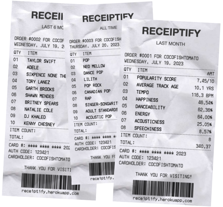 Receiptify es una aplicación online de código abierto que permite a los usuarios explorar su historial y hábitos de escucha en múltiples plataformas de streaming de música, incluyendo Spotify, Last.fm y Apple Music. Con Receiptify, puedes crear recibos de Spotify con tus 10 o 50 canciones y artistas favoritos del último mes, de los últimos seis meses y de todos los tiempos.