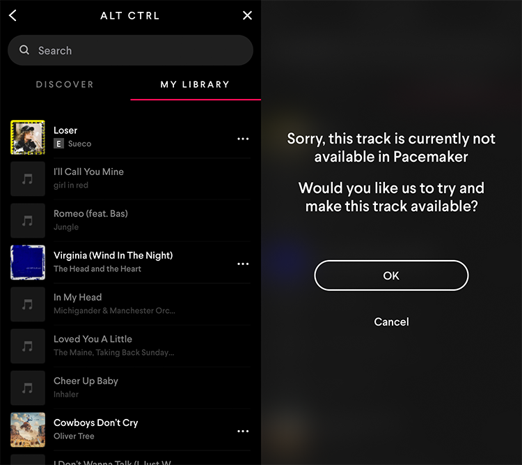 En realidad, solo sincroniza tus listas de reproducción de Apple Music/Spotify con su catálogo. Si las canciones no están disponibles en Pacemaker, no estará disponible.