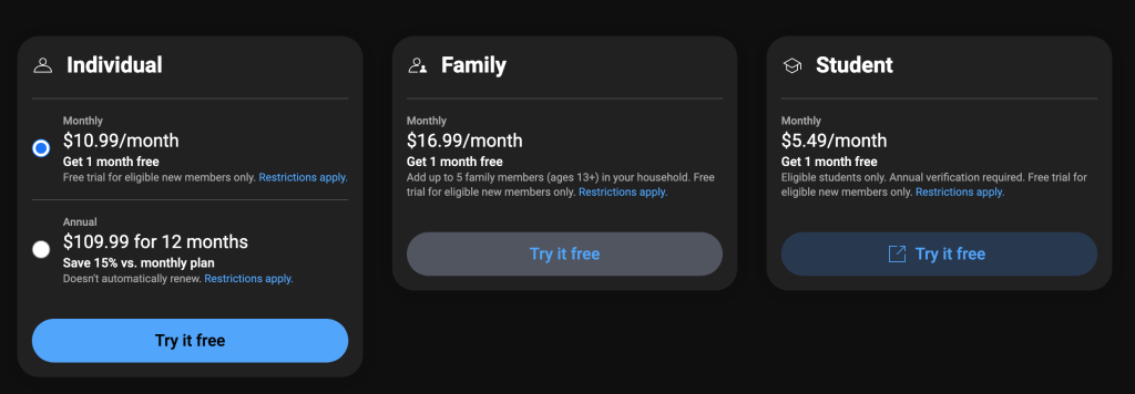 Los planes anuales son sólo para suscriptores individuales, pero no ofrecen prueba gratuita.