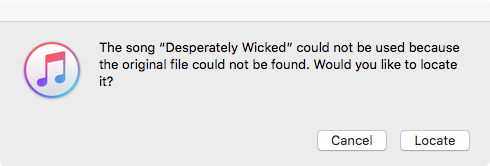 Haz doble clic en la canción y mira lo que dice iTunes. El error de abajo significa que la canción ha sido borrada de tu ordenador. Necesitas encontrar de donde viene y descargarla de nuevo.