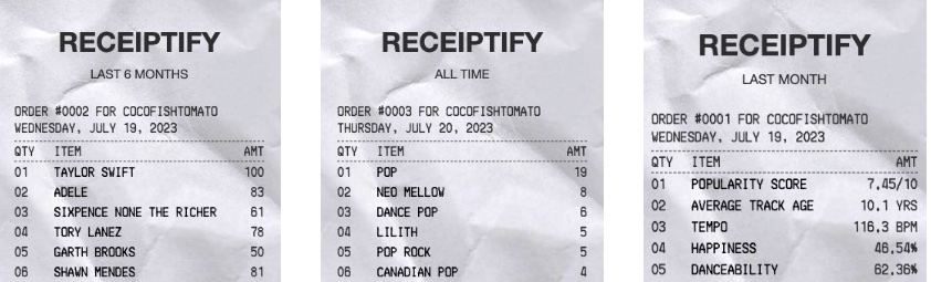 Receiptify es una herramienta en línea creada por Michelle Liu que ofrece una interesante visualización de las canciones y artistas más escuchados de un usuario en un formato similar al de un recibo. Puede presentar las 10 o 50 canciones y artistas más escuchados por el usuario durante el último mes, los últimos seis meses y todos los tiempos. Además, Receiptify genera recibos con tus principales géneros y estadísticas de Spotify. Además, si proporcionas un álbum de Spotify, Receiptify también puede crear un recibo con todas las canciones de ese álbum. Es una forma divertida y creativa de visualizar y compartir tu historial de escucha de Spotify y tus preferencias.