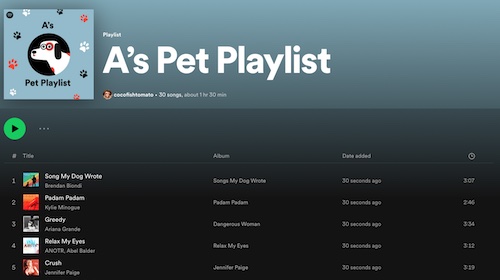 La portada de la lista de reproducción incluirá el nombre y la foto de tu mascota. Así que puedes personalizarla subiendo una foto de tu mascota y escribiendo su nombre.