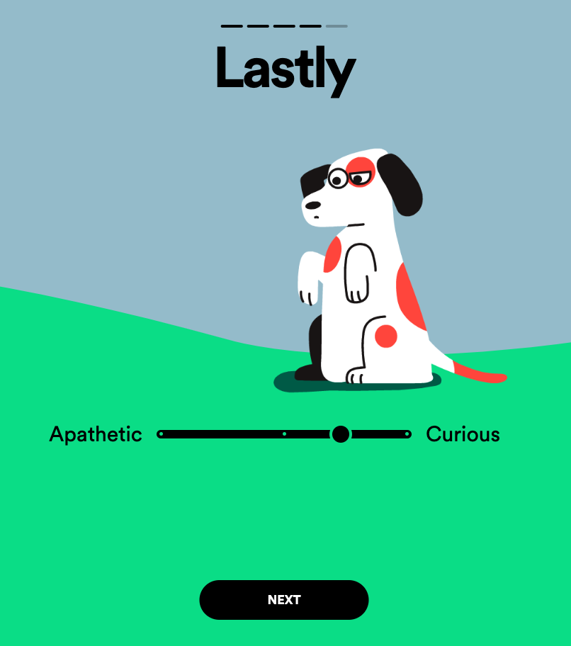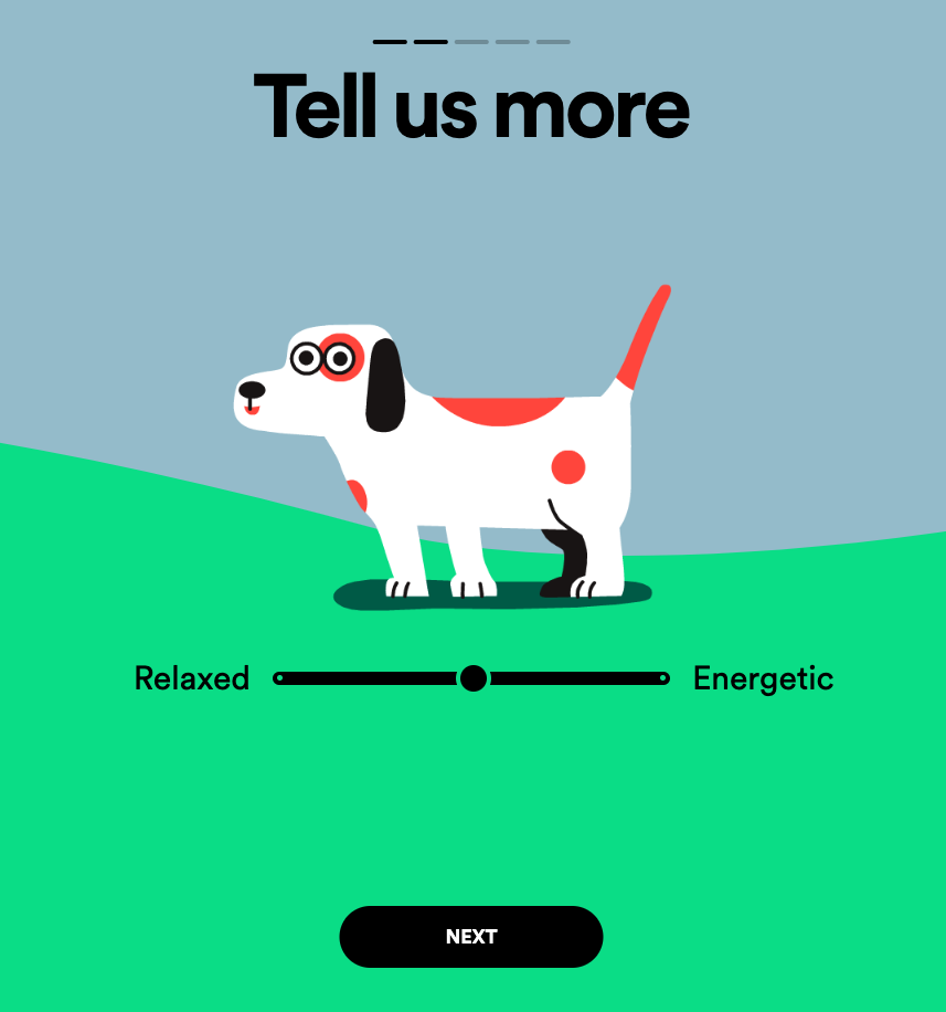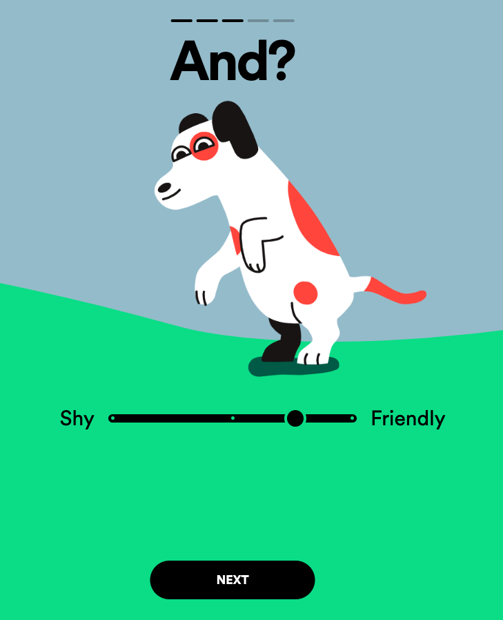 Para ayudar a Spotify a elegir el ambiente de la lista de reproducción, tendrás que establecer las personalidades de tu mascota. Desde relajado vs. enérgico, tímido vs. amistoso, hasta apático vs. curioso, selecciona qué rasgo se alinea más con tu mascota.