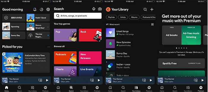 La interfaz de Spotify es más concisa que la de Tidal. Una de las razones por las que Spotify es tan popular es su interfaz fácil de usar. Al abrir la aplicación, encontrarás una serie de listas de reproducción personalizadas (tu “Mezcla del día”) que Spotify elabora en función de tus hábitos de escucha, junto con tus artistas favoritos, tus mejores listas de reproducción y tus nuevos lanzamientos.