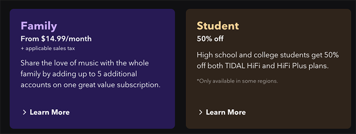 El plan familiar Tidal HiFi cuesta 14,99 $ / mes y el plan familiar Tidal HiFi Plus cuesta 29,99 $ / mes. Al igual que el plan familiar de Spotify (15,99 $ al mes), todos ofrecen 6 cuentas. Las cuentas únicas permiten a tu familia obtener mejores recomendaciones y descubrir nueva música adaptada a ellos.