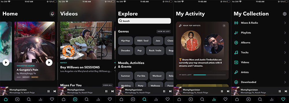 La interfaz de iOS de Tidal tiene 5 pestañas, Inicio, Vídeos, Explorar, Mi actividad y Mi colección.