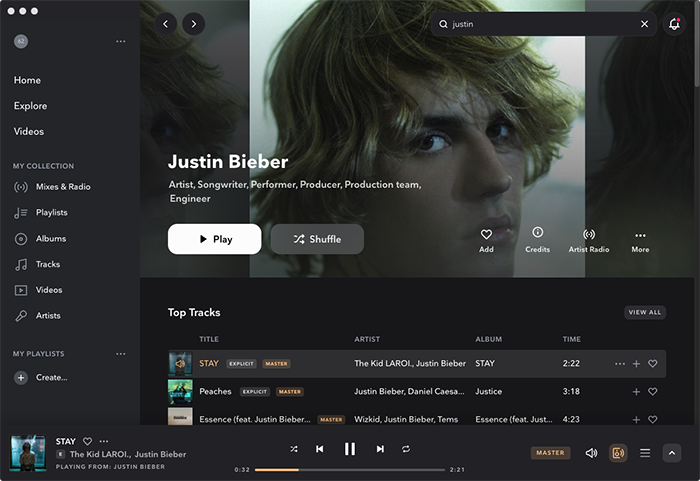 Spotify tiene más de 100 millones de canciones y más de 5 millones de títulos de podcasts. Spotify también tiene vídeos, pero no juegan un papel tan importante como con Tidal. Por ejemplo, no hay una sección dedicada a los vídeos. Puedes encontrar vídeos al buscar un artista o una canción, y eso es todo.