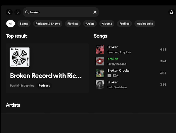 La función de búsqueda de Spotify es más fácil de usar que la de Tidal. Todos los resultados se muestran pero clasificados en la misma página. Desplázate hacia abajo y podrás encontrar rápidamente lo que buscas.