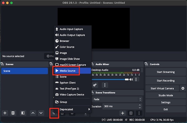 Ve a la aplicación OBS en tu escritorio y haz clic en el Add símbolo (símbolo +) bajo la sección Sources, luego selecciona Media Source.