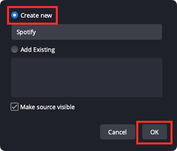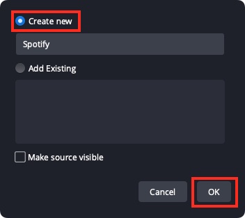 Selecciona Crear nuevo, dale a tu fuente multimedia un nombre como Spotify y haz clic en OK.