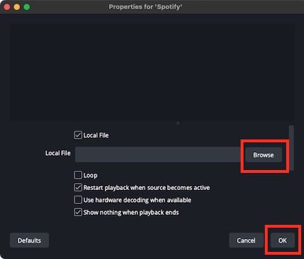 El método mencionado anteriormente que utiliza Window Capture en OBS sólo puede añadir música de Spotify como fuente de audio y mostrar la ventana de Spotify, pero no reproduce directamente música de Spotify en OBS. Para transmitir sin problemas canciones de Spotify en OBS, puede utilizar otra función en OBS para importar música descargada o archivos locales como fuentes de medios.