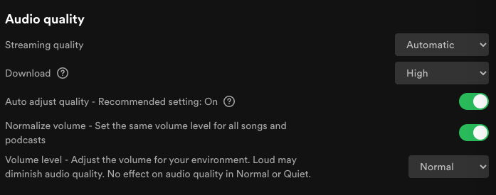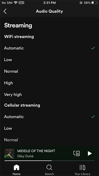 Si tu conexión a internet no es lo suficientemente rápida, cambia la calidad del streaming de audio a Automática o Baja.