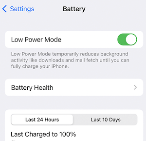 Para desactivar el Modo de bajo consumo, ve a Ajustes > Batería – Modo de bajo consumo. También puedes desactivar el Modo de bajo consumo desde el Centro de control. Ve a Ajustes > Centro de control > Personalizar controles y selecciona Modo de bajo consumo para añadirlo al Centro de control.