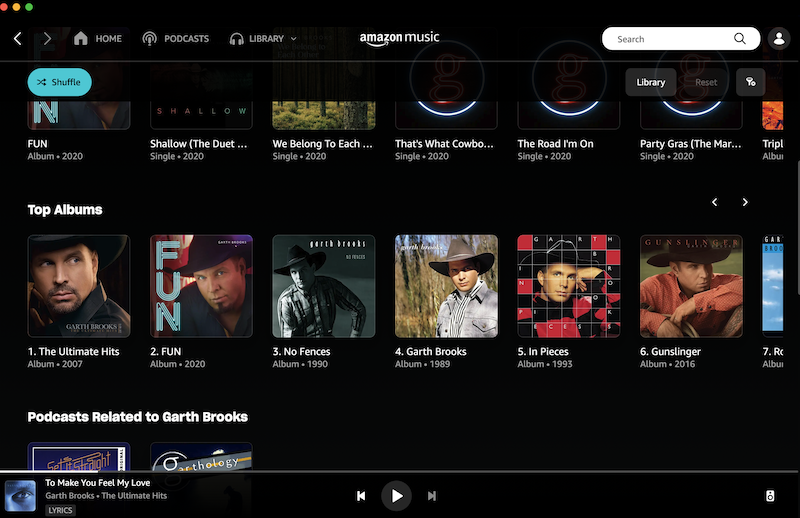 Actualmente, los fans solo pueden escuchar a Brooks en Amazon Music, después de que firmara un acuerdo exclusivo con el gigante minorista en 2016. Anteriormente se había resistido a participar tanto en servicios de streaming como en tiendas de música en línea como iTunes, alegando que quería vender álbumes en lugar de canciones sueltas.