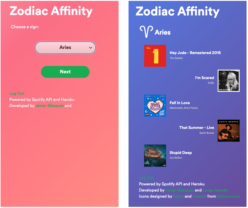 Spotify Zodiac Affinity es una aplicación web de terceros desarrollada por Javier Blázquez y Lucas Aranda. Ofrece un concepto intrigante al emparejar cinco de tus canciones favoritas con un signo astrológico elegido y crear una lista de reproducción personalizada única. Esta innovadora aplicación ha sido un éxito masivo alcanzando más de 395.000 usuarios en una semana, y siendo viral en redes sociales como Twitter y Facebook.
