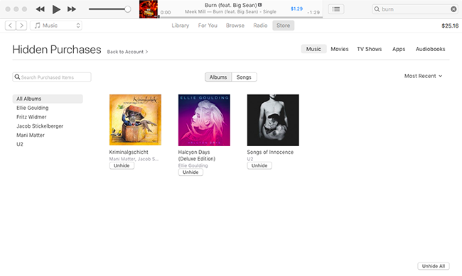 購入した曲が見つからない場合は、非表示に設定していないか確認してみましょう。