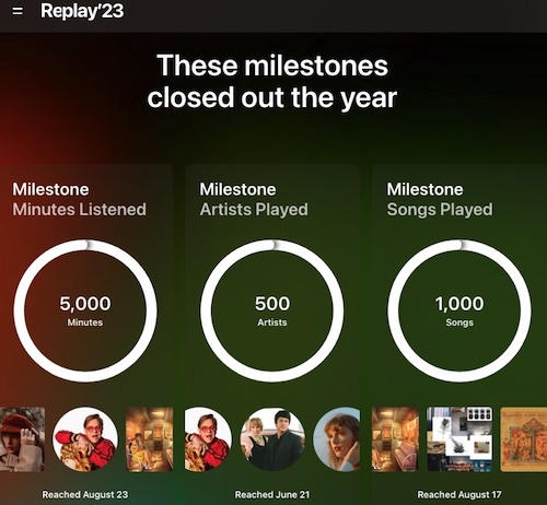 また、1000曲を聴いた、500アーティストを聴いたなど、その年に達成したマイルストーンも表示されます。