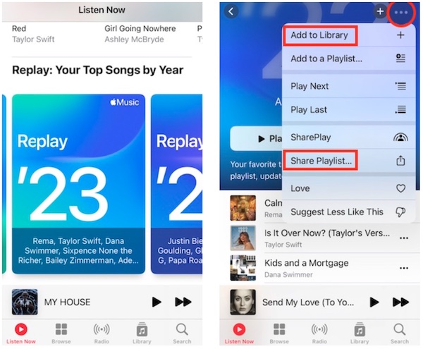 Apple Music Replayのプレイリストを削除/ライブラリに追加するには、プレイリストに移動し、 3つの点をタップし、“ライブラリから削除“/“ライブラリに追加“を選択します。