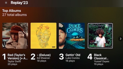 2019年から、Apple MusicはApple Music Replayとして知られる自動プレイリストを導入し、加入者の今年のトップソングを特集している。このリプレイ・プレイリストは通常、毎年年初に公開され、毎週日曜日に定期的に更新される。