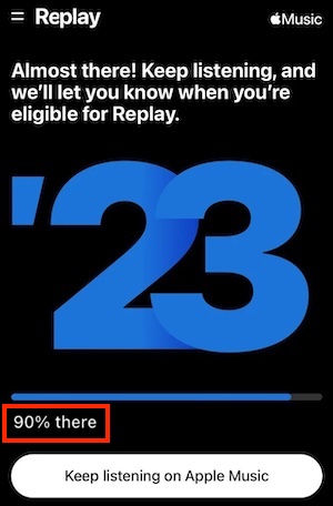 Apple Musicのリプレイが表示されない場合は、もっと音楽を聴く必要があるかもしれません。 次のサイトにアクセスしてください。replay.music.apple.comにアクセスし、プログレスバーから必要な音楽の量を確認しましょう。音楽を十分に再生すると、リプレイの準備ができたという通知が届きます。