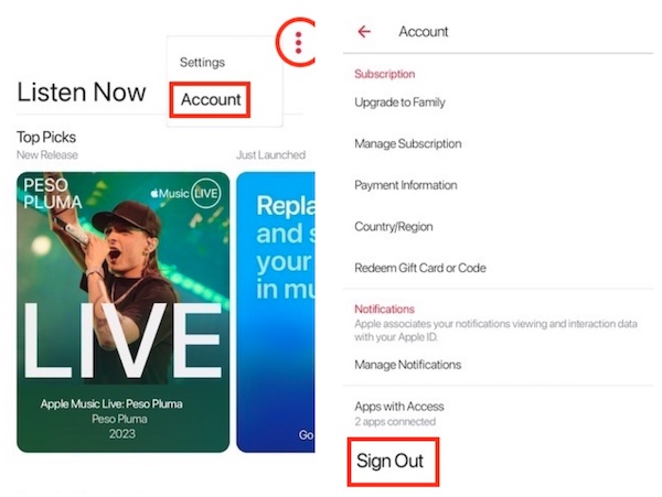 Apple Musicから一度ログアウトし、再度Apple Musicにログインしてアカウント設定を更新してください。また、現在のセッション中に発生した一時的な問題を回避したり、システムやアカウント設定に最近のアップデートや変更があった場合に、最新の設定を使用していることを確認することもできます。