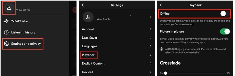 To disable Offline Mode on the Spotify mobile app, go to Settings > Playback > Offline mode to turn it off.
