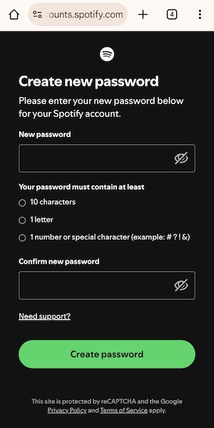 3. You’ll be redirected to create a new password for Spotify. Enter and confirm the new password, and click the “Create password” button.